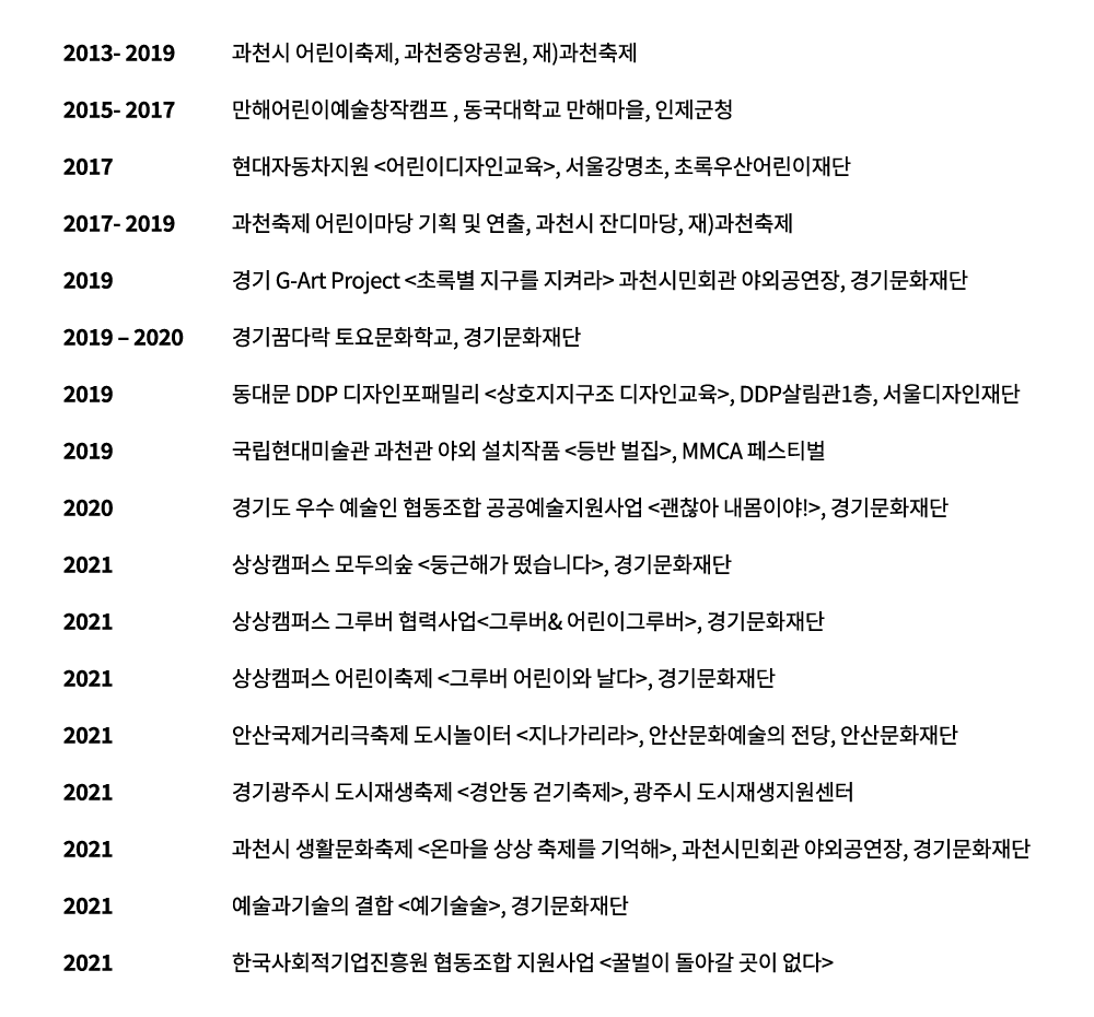 “아이를 닮은 예술가, 예술가를 닮은 아이”를 꿈꾸며, 어린이와 예술가가 만나 독창적이고 아름다운 예술 사회를 만들어나가는 꿈을 꾸고 있습니다. 아이들의 창의성과 자발성이 세상과 소통하고 어우러지기를 고민하며 놀이예술 공간을 창작하고 퍼포먼스를 펼쳐나갑니다.