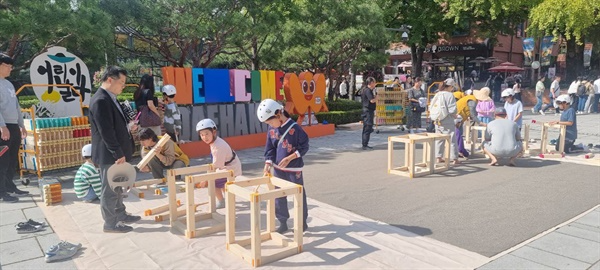 | ▲ 지난 5일, 서울 대학로에서 진행된 '예술로소풍' 거리예술축제에서 ‘어린이날다 사회적협동조합’는 사전 접수를 통해 모인 스무 명의 어린이들이 1시간에 걸쳐 나무들을 조립하며 정글짐 모양의 놀이터를 완성시켰다 |
